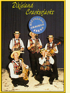 last till the year 2004. The band at this time welcomed a new musical talent on double bass. Studying at the conservatory in Zwolle, young, beautiful and she happened to be a woman. Especially the last was kind of a shock for some very conservative people in the Traditional Jazz World, but happily Marieke Ladrak was strong enough to fight these kind of sad figures. The official address of the band from the start till the year 2000 always had been in Tolbert, a little village in the province of Groningen. During Christmas 1996 the band for once played in it's Hometown. ![]() During spring the Crackerjacks went to Germany for a short tour, organised by Lutz Eikelmann, forever a friend of the band. The band played at Jazzclubs in Mühlheim, Cologne and Möhnesee. In Mühlheim the response of the audience was so enthusiastic that the band was invited to come back during the Jazz festival at a later time in the year. June 23 a new chapter started, the first official TV appearance. In Aalsmeer at the then renowned Studios at the van Cleefkade 9 the band recorded "When You're Smiling", with vocals by Koos Greven. Bert, Kevin, Michel and Piet were the other members present that day. It was broadcasted by the Veronica Channel. Also during this year another CD production was released on which the
