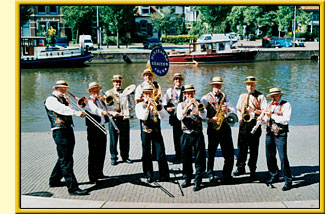 A new regular place to play was the Casino in Groningen. After a first appearance in April the band would return there many times. Michel Muller married to his Sanny during this year and of course the band couldn't miss this event. During this evening the band met drummer Raymond van der Hooft whom in later years would become the band's regular drummer. During July the band went abroad again. This year the band was invited to play six performances at the annual Birmingham Jazz Festival in England. Especially for Kevin and Michel a great happening. Kevin could for the first time in years speak his mother's tongue all day long and Michel returned to a city where he had been living for quite a while, meeting many old friends from these earlier days. Michel also turned out to be a specialist in driving at the left side of the street, as opposed to the right side, not the 'wrong' side, which large parts of Continental Europe use. The summer months were totally filled out with performances as marching band. 'Midweekfeesten' in Steenwijk, Blauwvingerdagen in Zwolle, events in Dedemsvaart and Hoorn, Thursday Meppeldays, everywhere the band could be seen and heard. Many pairs of shoes could be thrown away after this summer. Another nice international trip was a performance at the International Jazz Festival in Bremen. One of the first occasions that drummer Raymond van der Hooft would play with the band. During Christmas the band would play at Lauswold in Beetsterzwaag. A